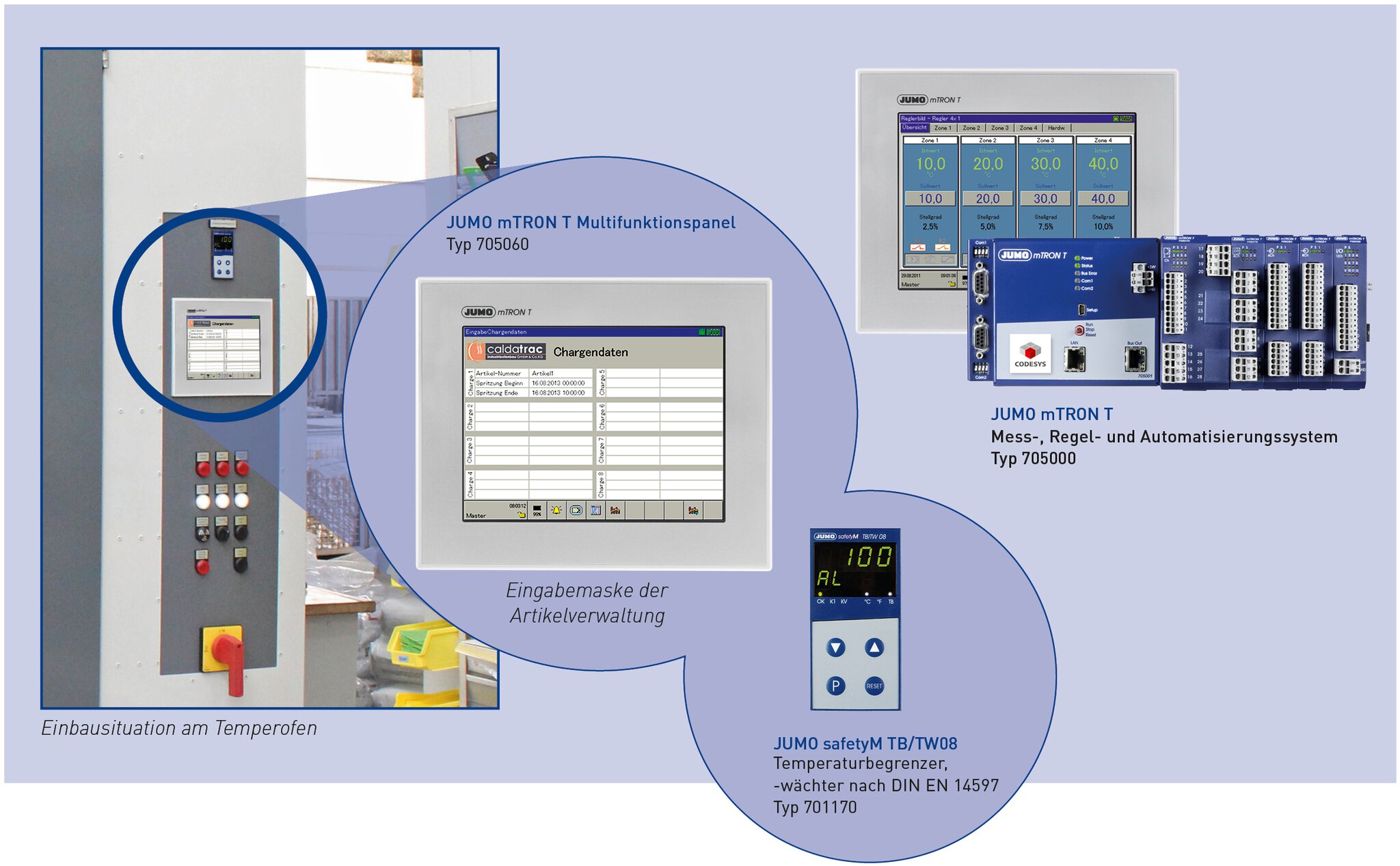 Um den Ansprüchen der Kunden gerecht zu werden, muss auch bei hohen Stückzahlen eine gleichbleibende Qualität im Produktionsprozess garantiert werden. In einem neuen Temperofen der Firma caldatrac® Industrieofenbau GmbH & Co. KG aus Höchheim wird diese konstante Qualität mit Hilfe des JUMO mTRON T Automatisierungssystems sichergestellt. Die Herausforderung bei der neuen Anlage bestand darin, dass die dort behandelten Duroplaste durch eine gleichmäßige und genau festgelegte Wärmebehandlung getempert werden müssen.