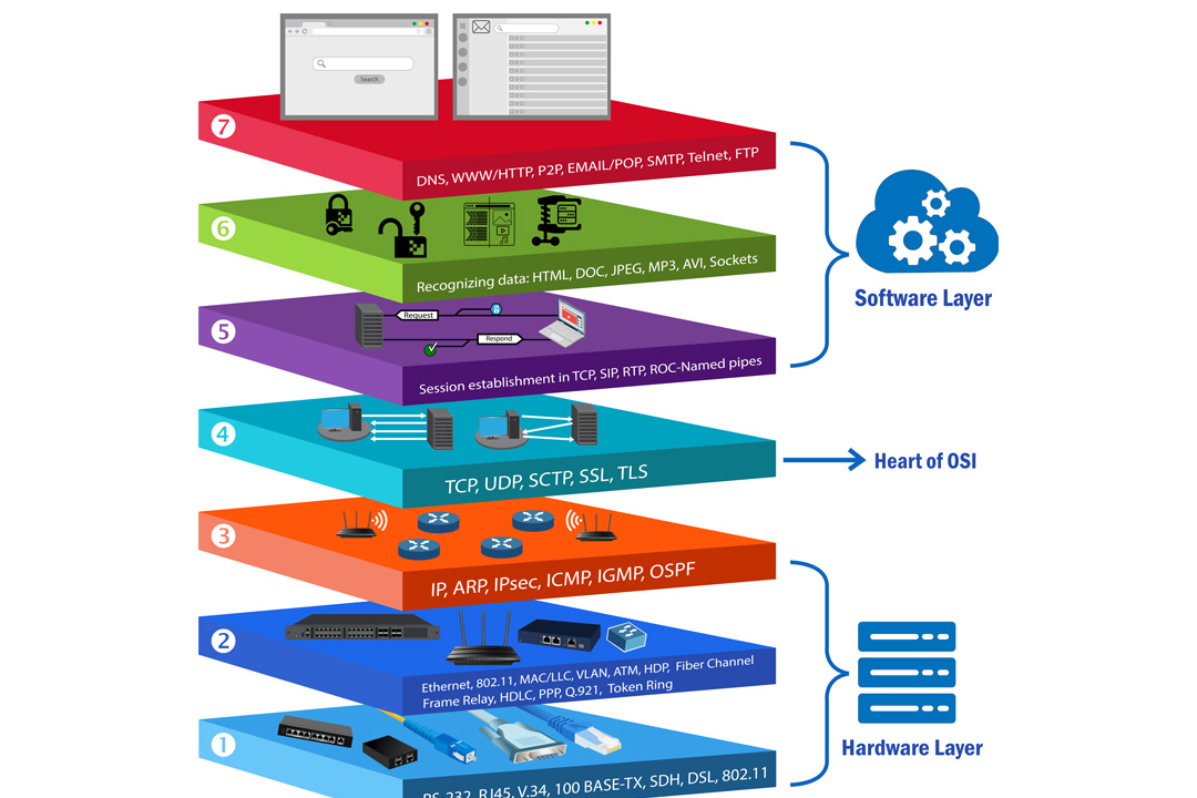 OSI-Modell: (1) Physical Layer, (2) Data Link Layer, (3) Network Layer, (4) Transport Layer, (5) Session Layer, (6) Presentation Layer, (7) Application Layer