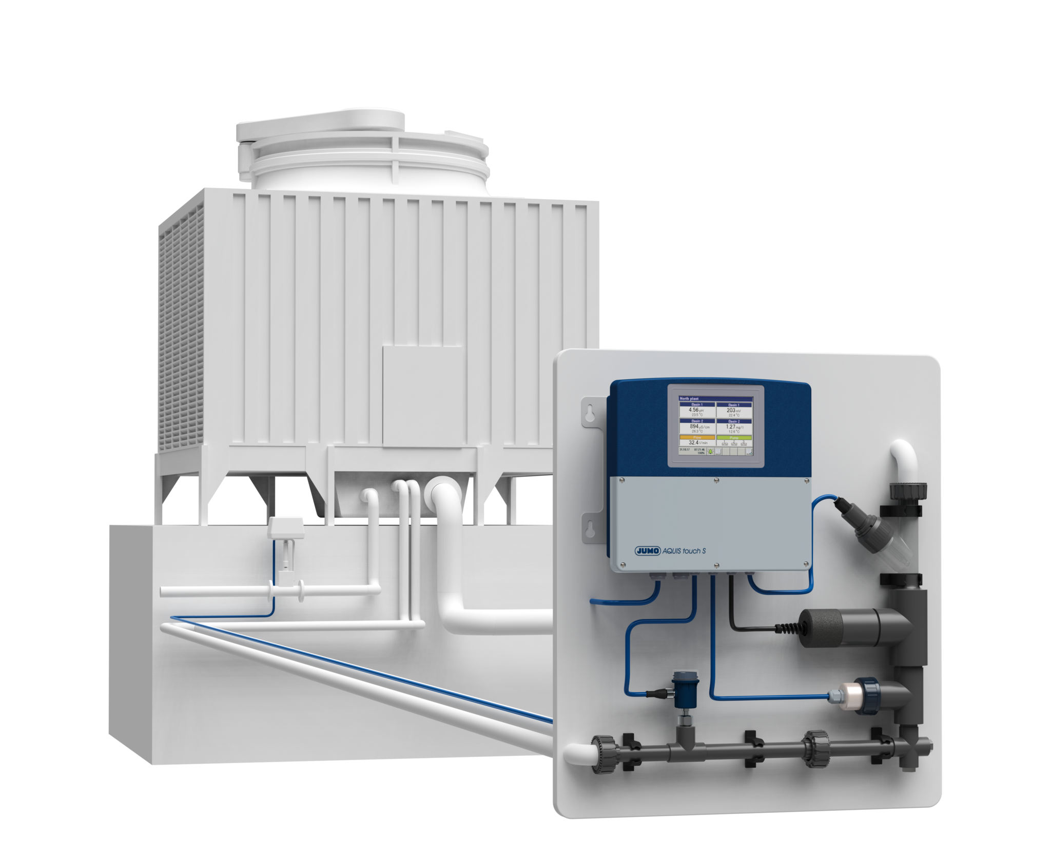 Im Kühlturm wird überschüssige Wärme aus technischen Prozessen durch Verdunstung von Wasser abgeführt. Um der Eindickung des Wassers durch die Verdunstung entgegen zu wirken und die Hygiene im Kühlwasser zu gewährleisten, bietet JUMO die entsprechende Mess- und Regeltechnik. Durch die Überwachung der Messgrößen Leitfähigkeit, Trübung und pH-Wert, wird die Qualität des Kühlwassers sichergestellt.
