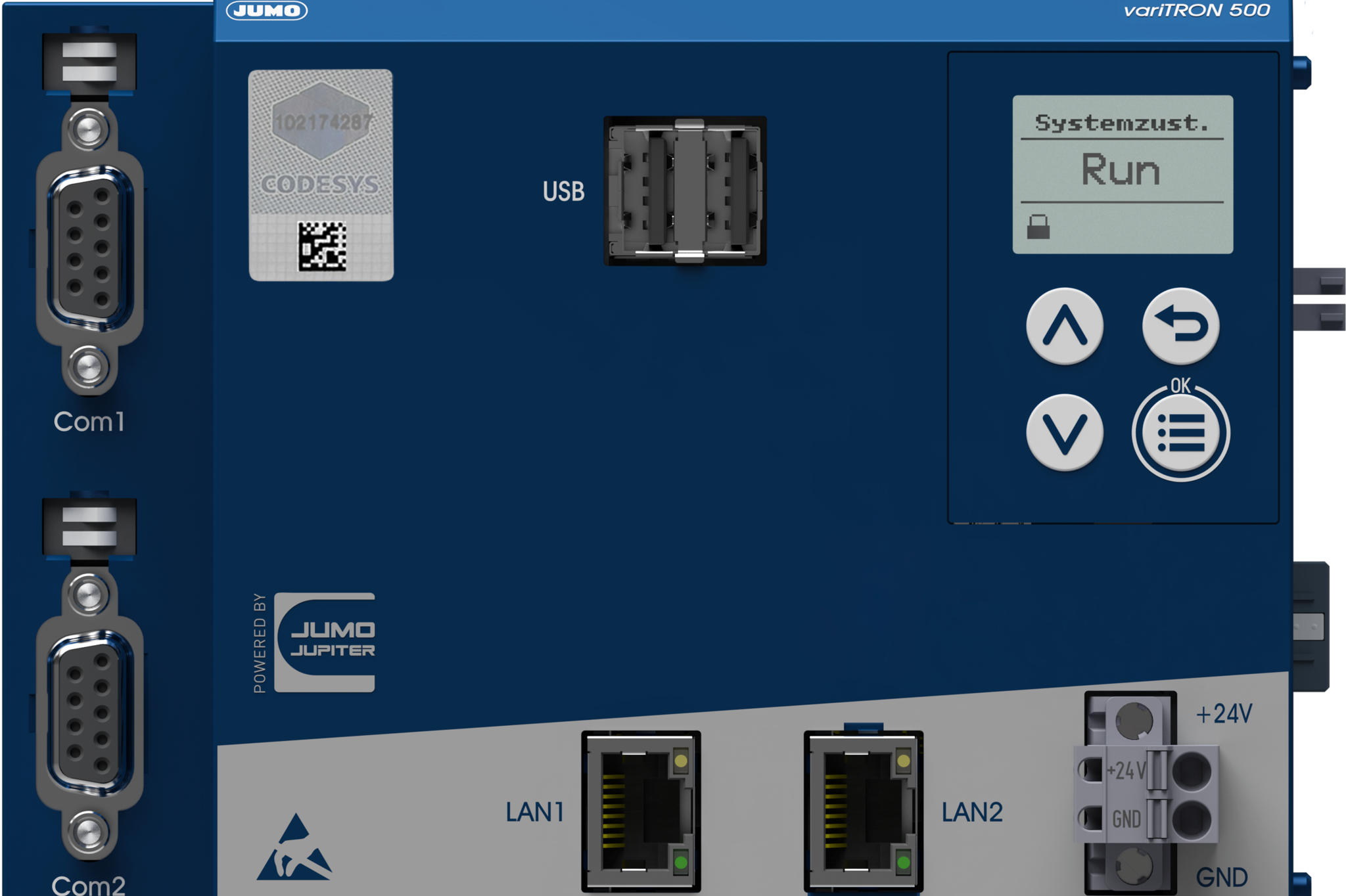 Das neue Automatisierungssystem von JUMO ist modular aufgebaut und hochskalierbar. Grundlage von JUMO variTRON bildet die Hardware-Plattform JUMO JUPITER und eine flexible Software-Architektur. Als Programmierumgebung der SPS kommt die CODESYS PLC zum Einsatz. <ul> <li>Hohe Geschwindigkeitsperformance</li> <li>Gleichzeitiger Betrieb von bis zu 120 Regelkreisen</li> <li>Prozessdatenaufzeichnung von bis zu 240 Kanälen und 20 Chargen</li> <li>Moderne Kommunikationsschnittstellen, z. B. OPC UA und MQTT</li> <li> Integration von verschiedenen Feldbussystemen wie PROFINET, EtherCAT und Modbus TCP/RTU</li> <li>Einfache Integration neuer Software-Funktionen via CODESYS Store</li> </ul>