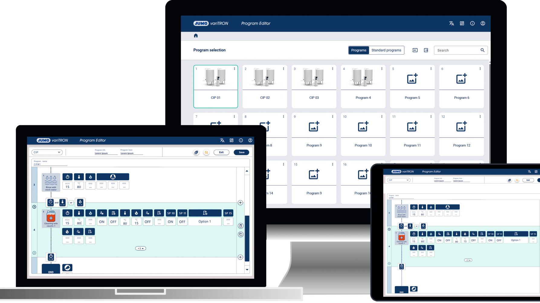 JUMO variTRON Program Editor für eine CIP-Anlage auf PC, Tablet und Laptop