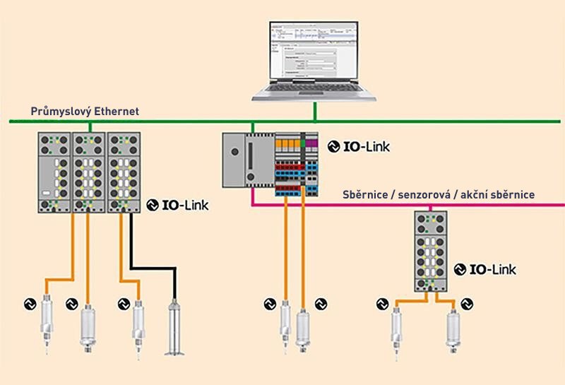 IO-Link kombinuje komunikaci od úrovně řízení až po nejnižší úroveň průmyslové automatizace – senzory a akční členy v síti sběrnice.