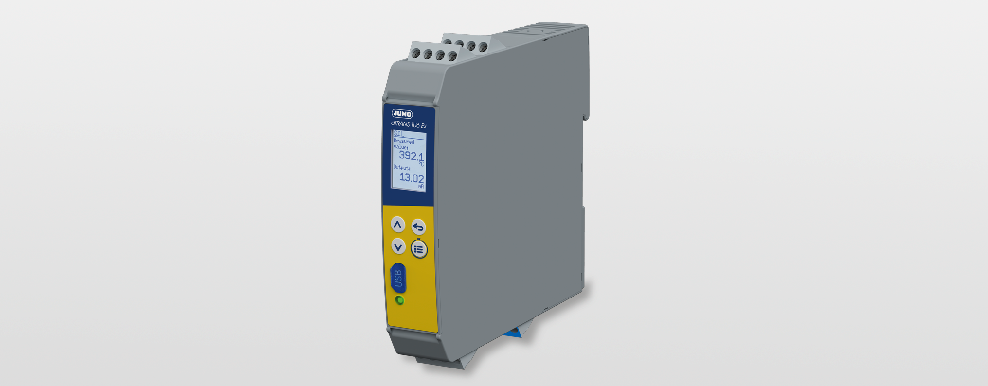 The device can be used with RTD temperature probes, thermocouples, resistance transmitters, as well as voltage and current signals. It converts the input signal into an output signal (0(2) to 10 V or 0(4) to 20 mA). The universal measurement input with 22-bit resolution ensures maximum measuring precision with the JUMO dTRANS T06 Ex.