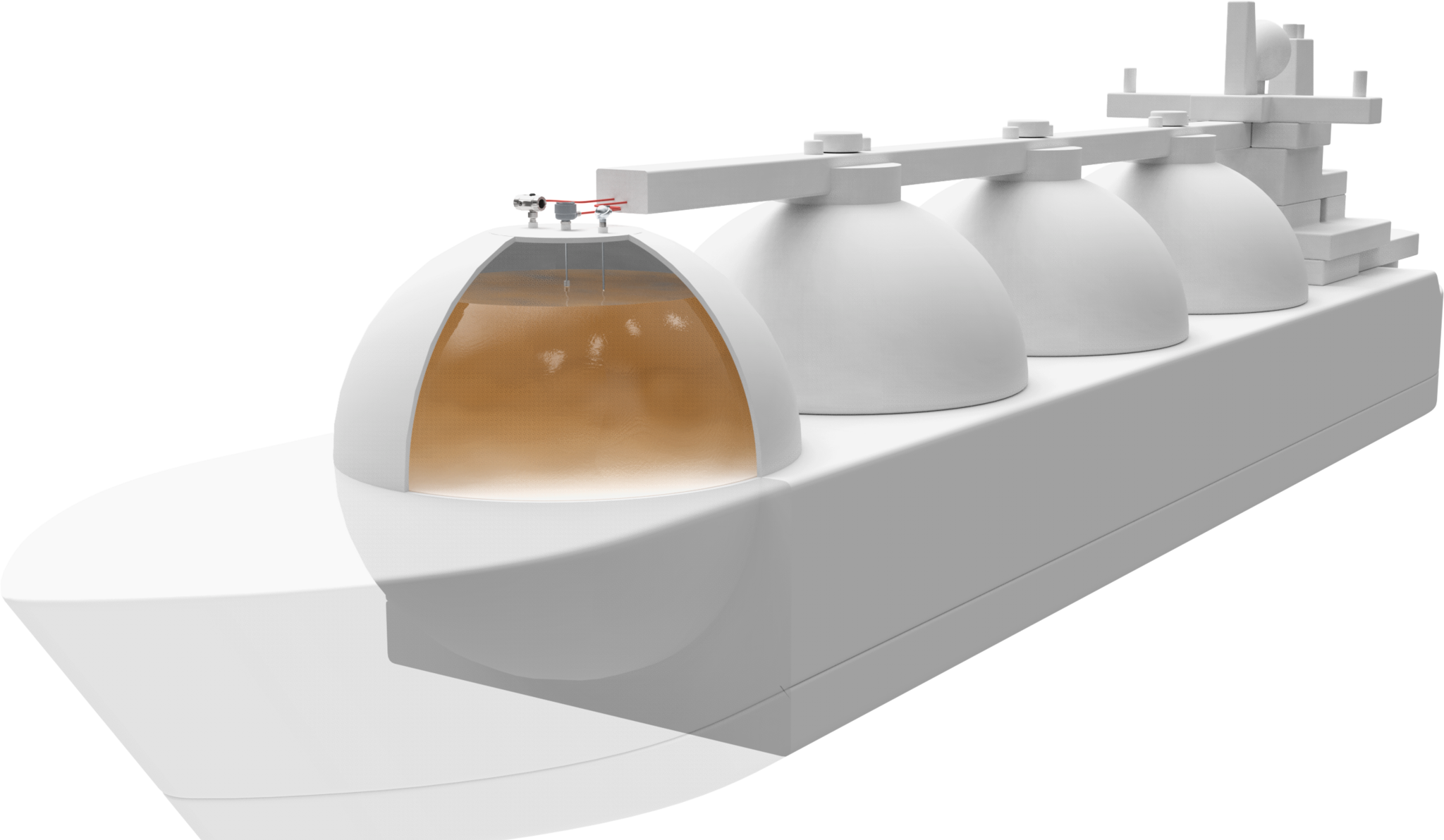 For the transport of oil or liquid gas, spherical tanks are used, which project halfway over the deck of the tank ship. Due to the high pressure and temperature loads that affect the materials, the tanks are made of special stainless steel and insulated from the hull. The applied measurement and control technology must have approvals both for marine applications and for risk of explosion.