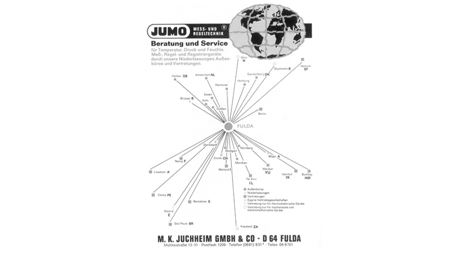 I 1966 begyndte produktionen af platin-glassensorer. Måle- og kontrolapparater på elektronisk basis blev føjet til produktprogrammet. Mens verden sørgede over Beatles' opløsning, grundlagde Moritz Juchheim i 1971 det første datterselskab i Belgien. Dette var startskuddet til internationaliseringen. I 1978 var JUMO den første virksomhed, der anvendte processorer inden for reguleringsteknologi.