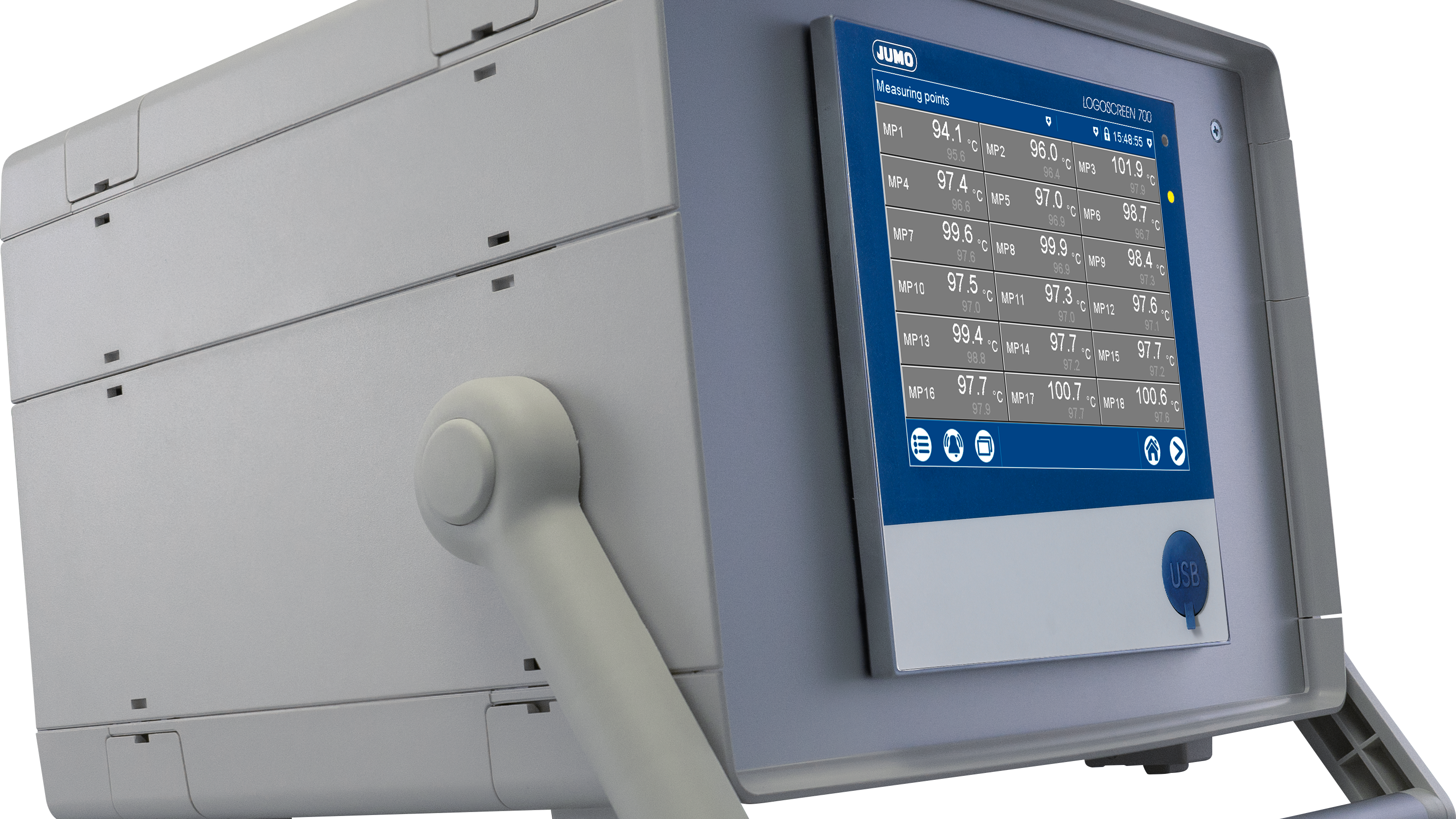 The JUMO LOGOSCREEN 700 can be used in both stationary and mobile applications thanks to its compact design and carrying case. It has a specially developed connection terminal for high-precision measurements with thermocouples and enables parallel measurement at up to 18 measuring points. Fully automated testing is carried out via all common browsers and also includes automatic process evaluation.