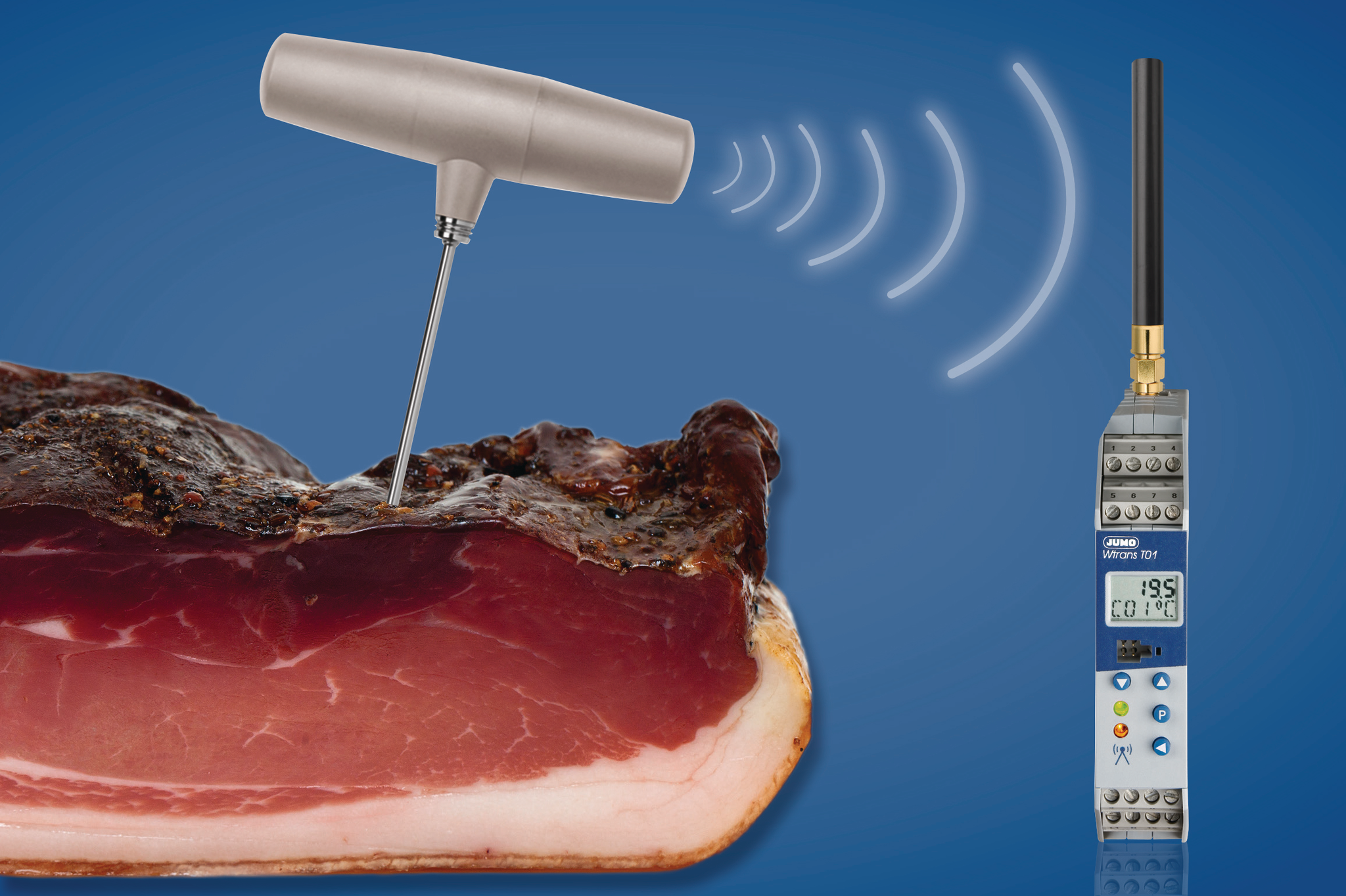 Wireless temperature sensors are used in the meat industry in smokehouses and production processes, among others. At the image is wireless temperature probe for smoker and meat JUMO wTRANS T.