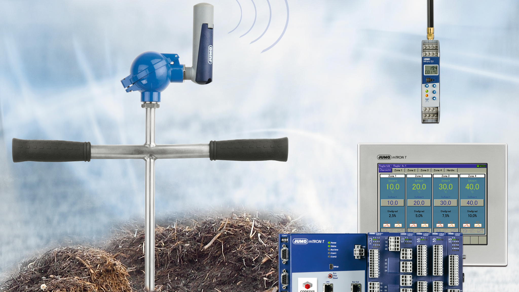 Measuring system for a composting plant consisting of wireless wTRANS sensors, receiver and JUMO variTRON 500 PLC controller