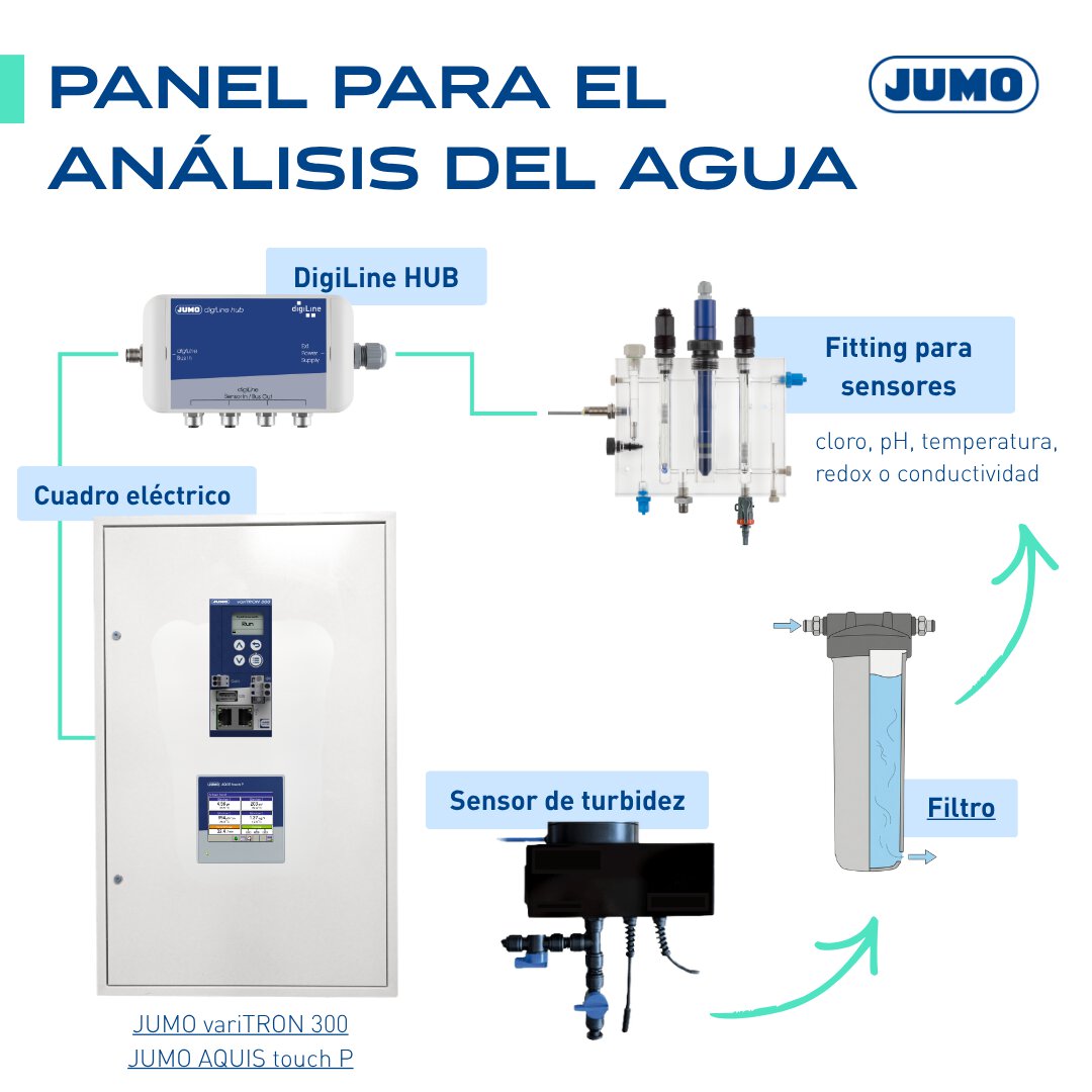 En Expoquimia mostramos la pirámide de automatización JUMO aplicada a un ejemplo práctico para el control del agua: sensores de cloro, pH, temperatura, turbidez y redox conectados a variTRON 300, AQUIS touch y JUMO Cloud para monitoreo y control automático de desinfección de agua. Una solución "del sensor a la nube" que facilita el cumplimiento normativo y simplifica la gestión diaria de instalaciones de riesgo.