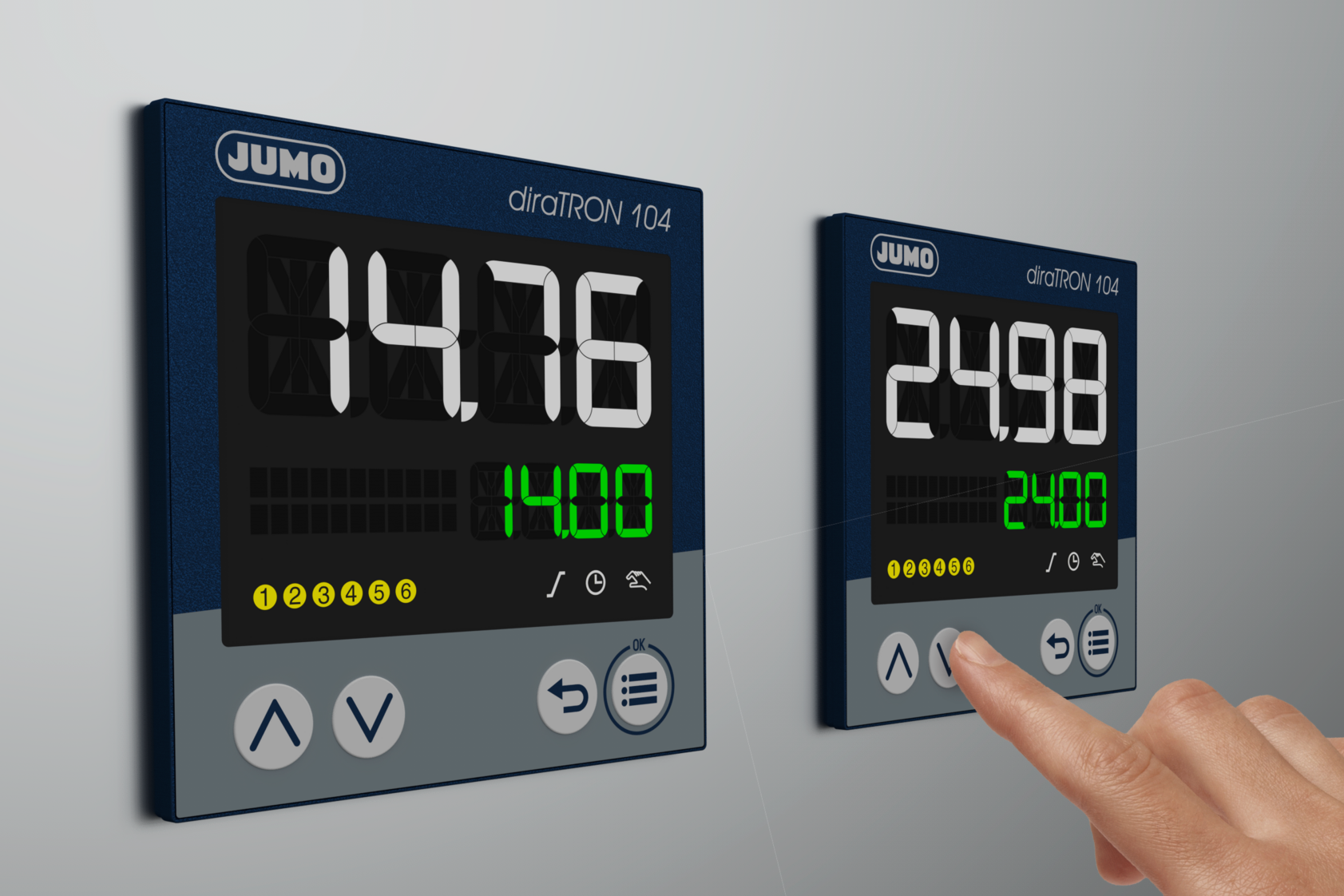 After specification of the setpoint value, the actual value increases steeply until it reaches the proportional band. If the actual value enters the proportional band, the P component is reduced and the I component ensures the value is adjusted to the setpoint value. The increase of the I component takes place slowly on account of the relatively large rt and the control deviation is slowly eliminated. For faster integration, rt must be set smaller; dt is also reduced in line with the ratio dt/rt = 1/4.