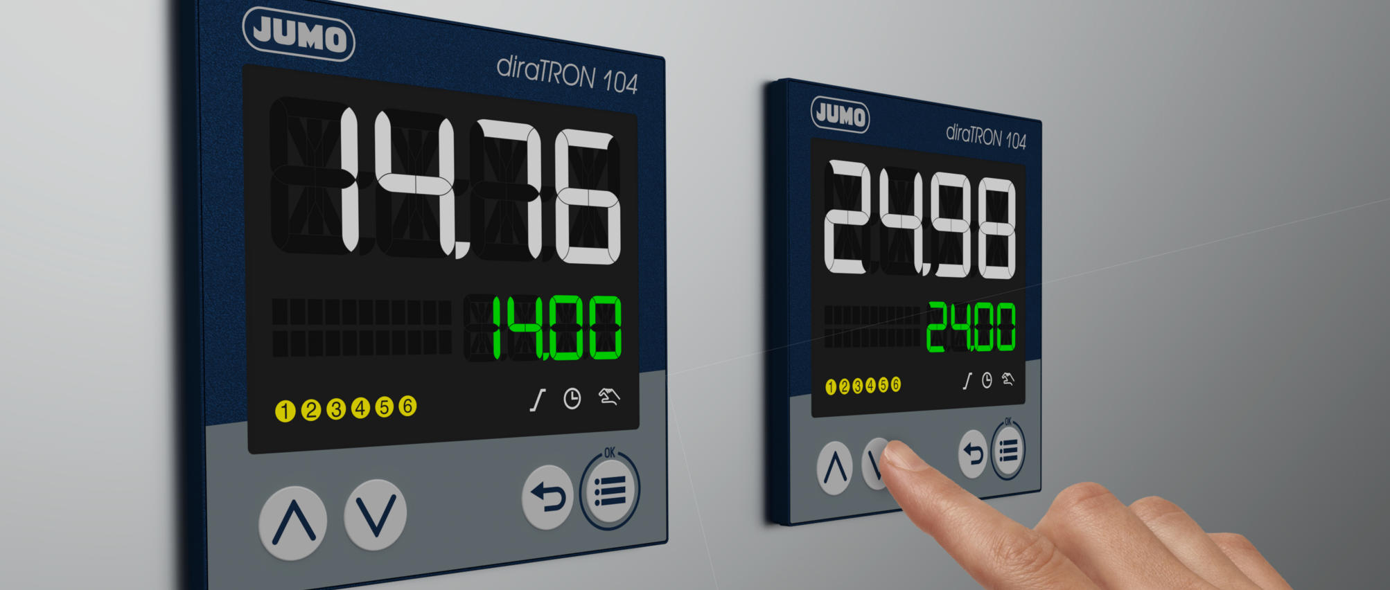 While most controllers from JUMO can be used almost universally, specific temperature controllers are also available that have the necessary inputs for RTD temperature probes and thermocouples as well as outputs and functions for temperature control. In some cases, they are also specialized for certain industries or applications such as meat processing or refrigeration.