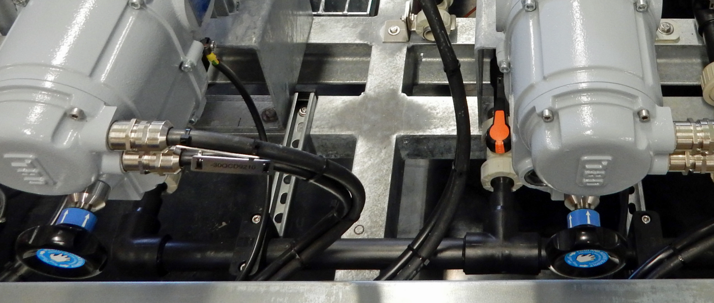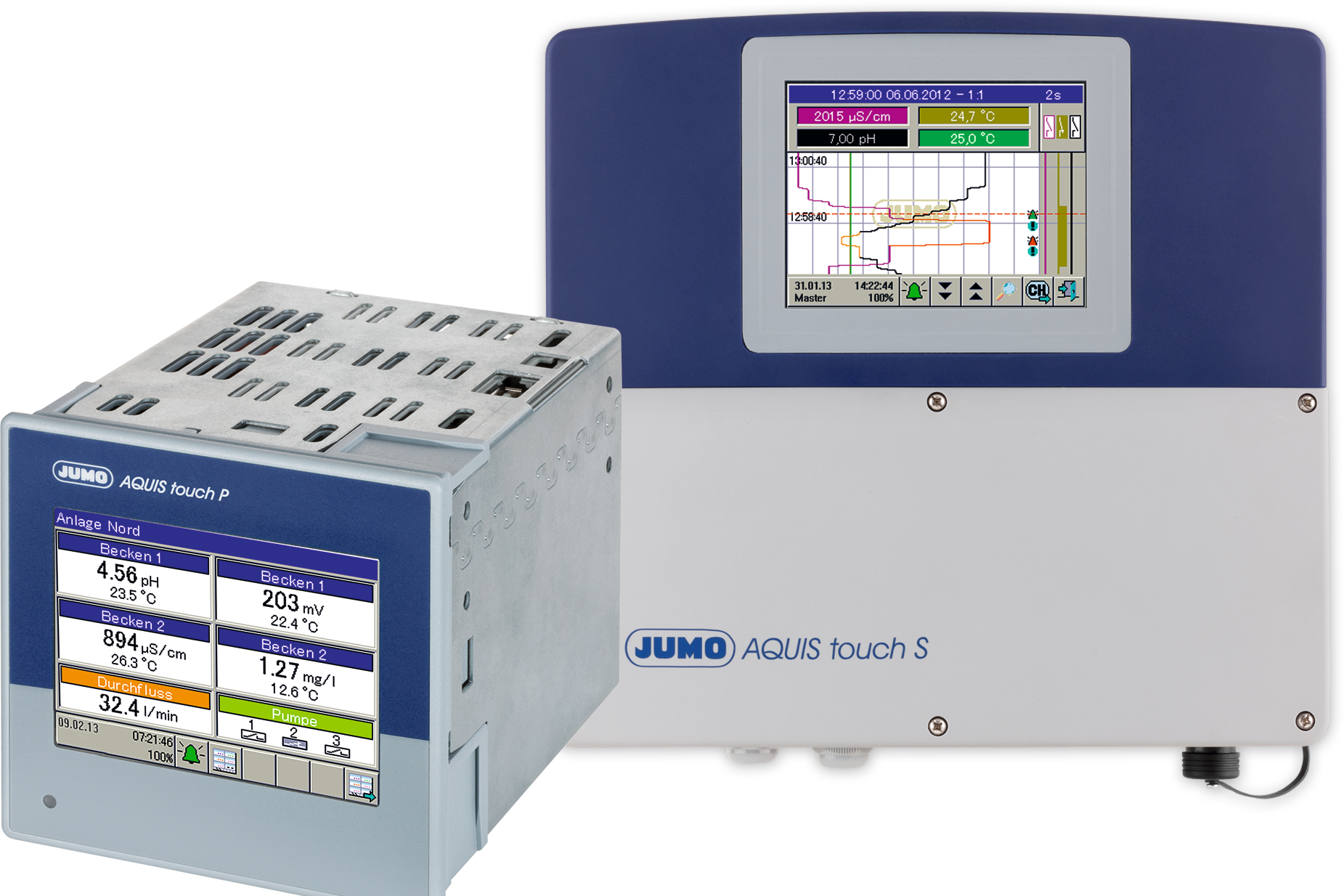 A JUMO AQUIS 500 pH ammonia value transmitter is visible on the metal bar, and a JUMO ammonia detector is on the pipe in the fitting.
