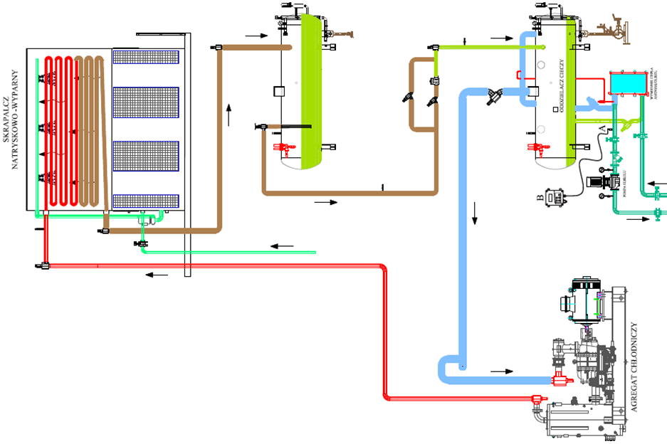 Ammonia refrigeration systems has quite simple work of operation. Liquid ammonia passes from the tank to the separator. There it is then subjected to the processes of clumping and dehermetization. In the next step, ammonia refrigerant passes through a throttle where it mixes with hot, gaseous ammonia and reduces its temperature. It absorbs the heat of the water, which flows through the evaporator and transforms into a gaseous state. The refrigeration cycle repeats, sustaining cooling process.