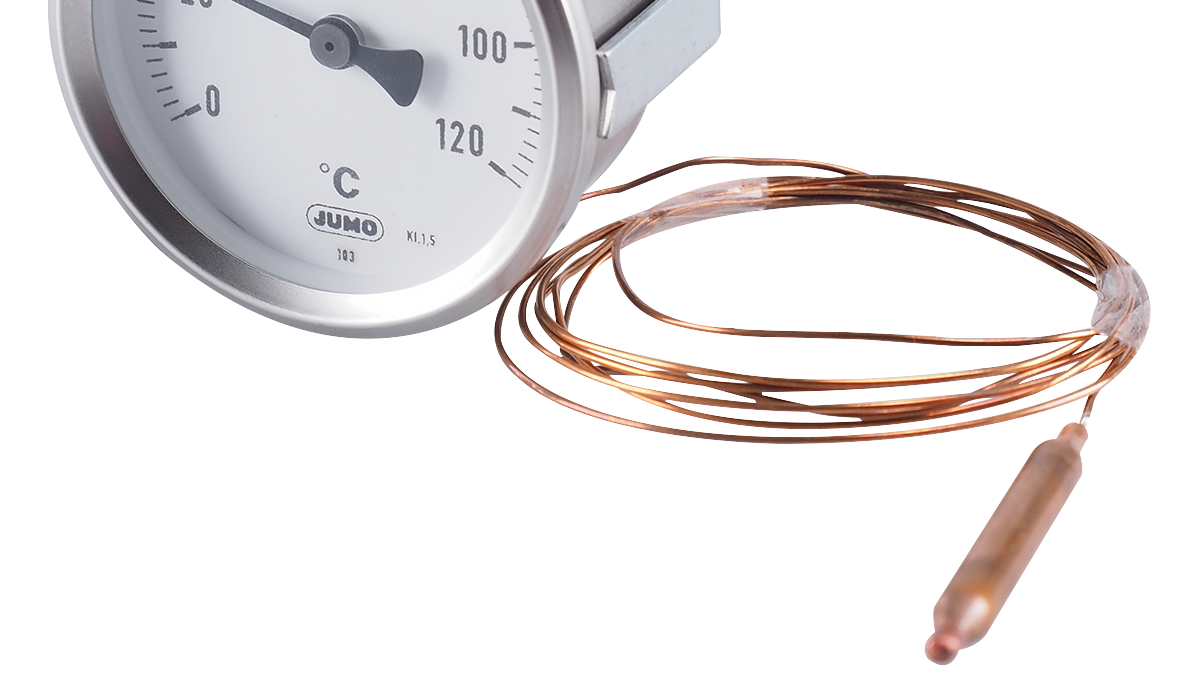 With a dial thermometer with a capillary, it is possible to measure temperatures in inaccessible points. Even the smallest pipes can be reached by means of the contact bulb. Another advantage is the bridging of larger distances, so that this type of thermometer can be centrally integrated into a control cabinet, switchboard or control panel.