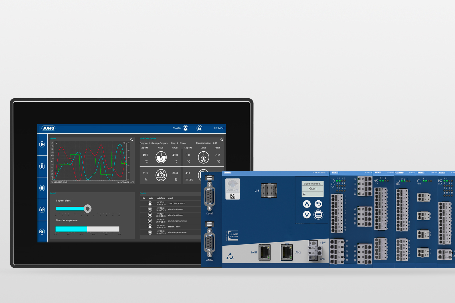 In this implementation, we used a JUMO meroTRON modular controller (703051) with PLC functionality and a JUMO LOGOSCREEN 601 screen recorder (706521)