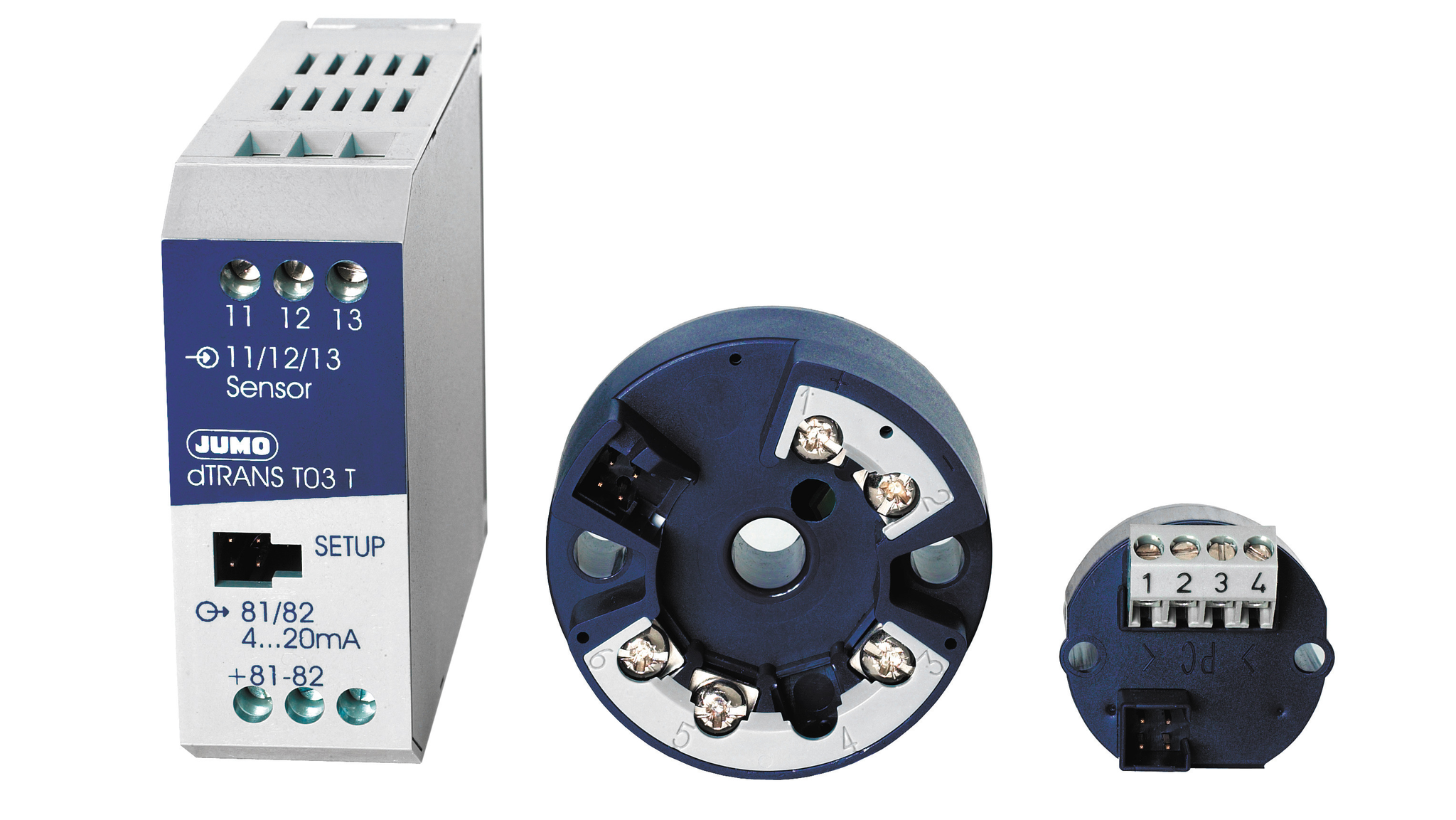 Temperature transmitters of the JUMO dTRANS T03 series – on the left DIN rail mounted, two heads on the right