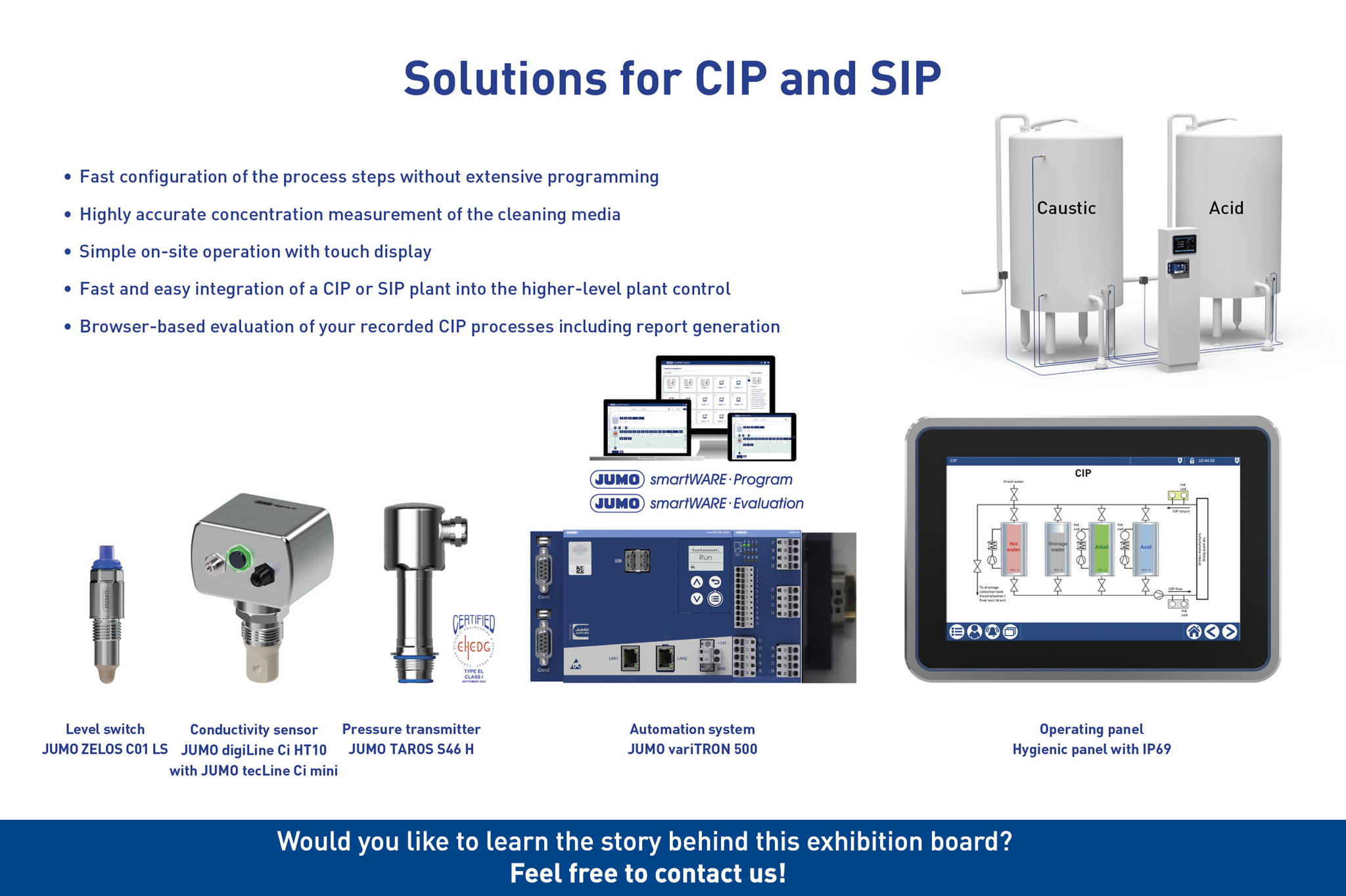 CIP and SIP processes are complex and time-consuming. Consequently, it is important that they run safely and automated. Equally as important is that the parameters of the individual process steps are automatically documented. The JUMO variTRON 500 and the JUMO smartWARE family allow the individual program steps to be defined and parameterized quickly as well as easily via a touch display. Data evaluation can be performed from any location via JUMO smartWARE Evaluation, the JUMO Cloud, or JUMO smartWARE SCADA.