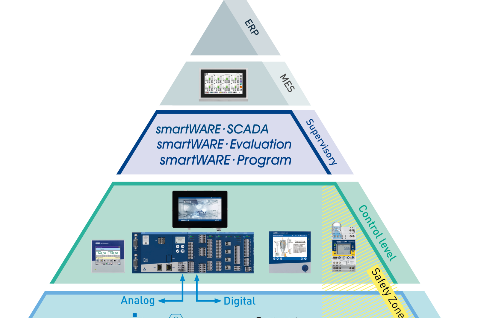 Automation systems are located at the control level of the automation pyramid. They process the signals from the sensors and control the actuators. They pass data up the pyramid to the management level.