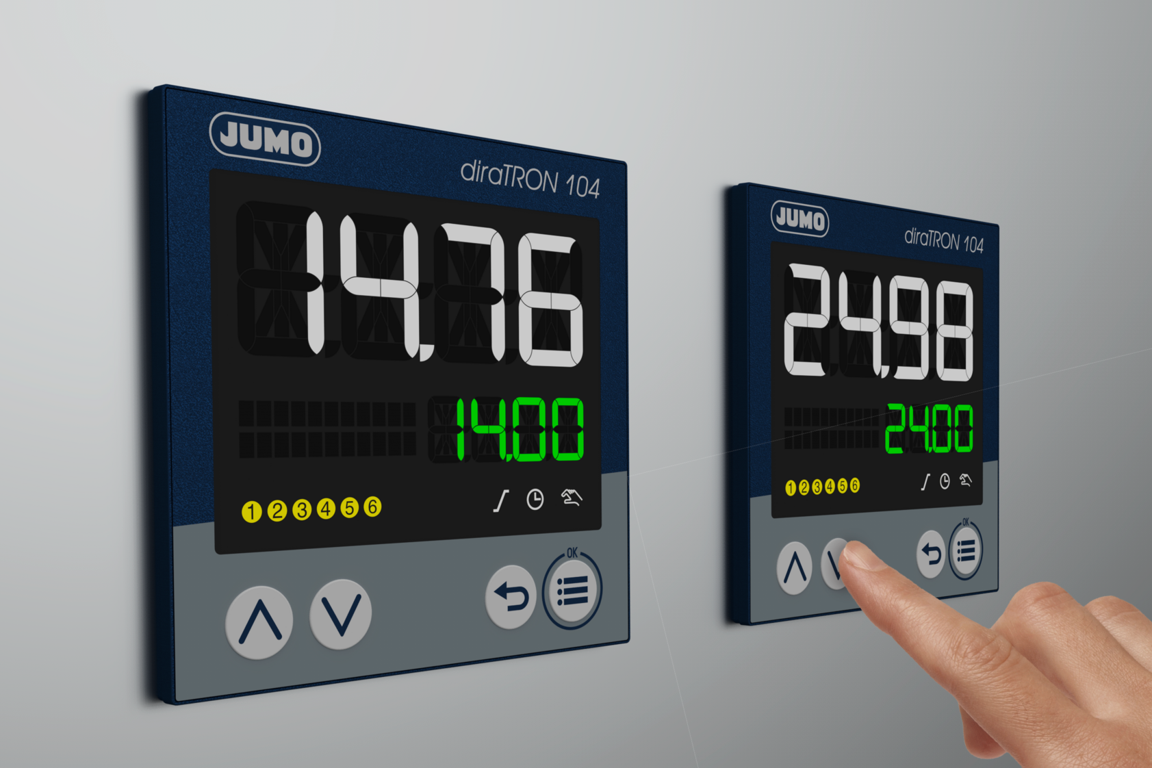 After specification of the setpoint value, the actual value increases steeply until it reaches the proportional band. If the actual value enters the proportional band, the P component is reduced and the I component ensures the value is adjusted to the setpoint value. The increase of the I component takes place slowly on account of the relatively large rt and the control deviation is slowly eliminated. For faster integration, rt must be set smaller; dt is also reduced in line with the ratio dt/rt = 1/4.